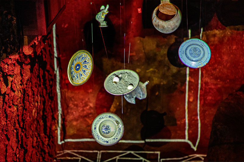 À l’aide de projecteurs, d’animations et d’effets spéciaux, l’aspect d’origine des édifices est reconstitué avec leurs structures murales, leurs décorations et leur ameublement.